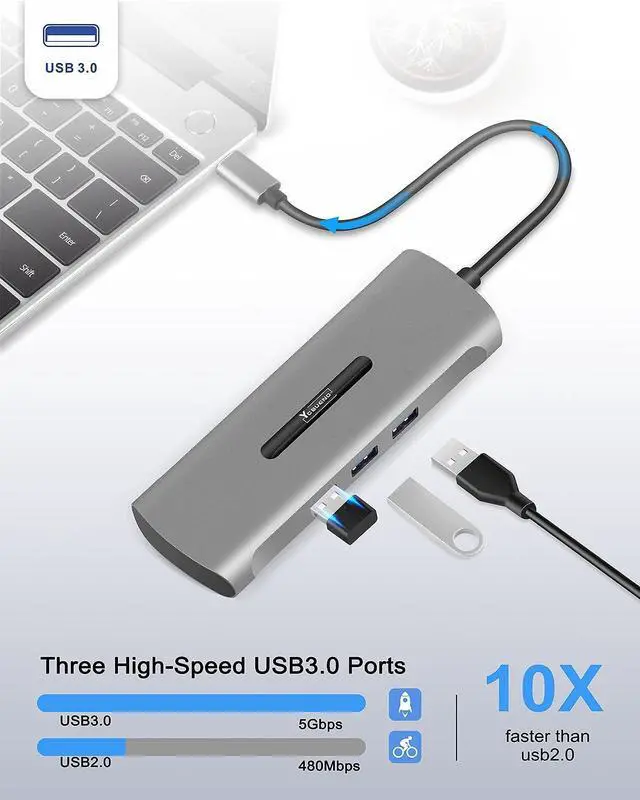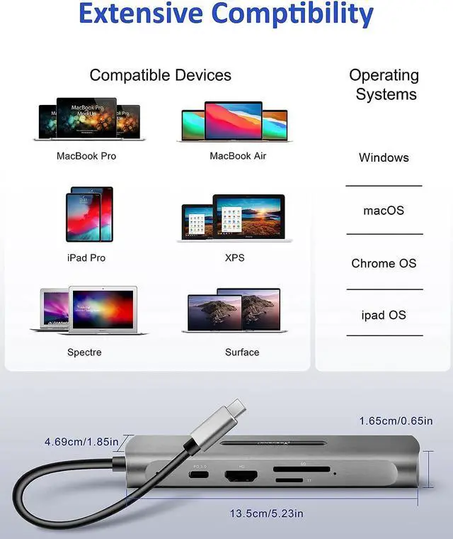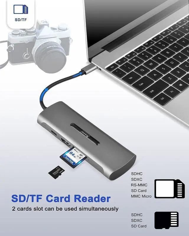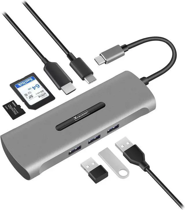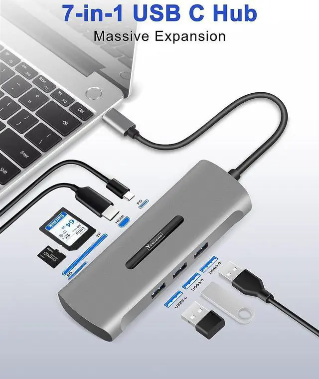 7-in-1 Multiport USB C HubPlug and play, Easy to Use, NO additional driver required. USB-C devices with the multiport USB-C hub featuring, 4K@30Hz HDMI port, 3 USB 3.0, 100W PD charging port, SD/TF card reader.