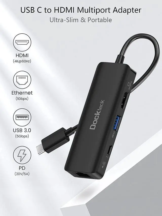 What You Will Get: 1 × Dockteck 4-in-1 Multiport USB C Hub with 4K@60Hz HDMI, USB 3.0, USB-C PD and Ethernet ports, worry-free 24-month warranty and lifetime technical support as well as friendly customer service. Compact design, easy to carry and use