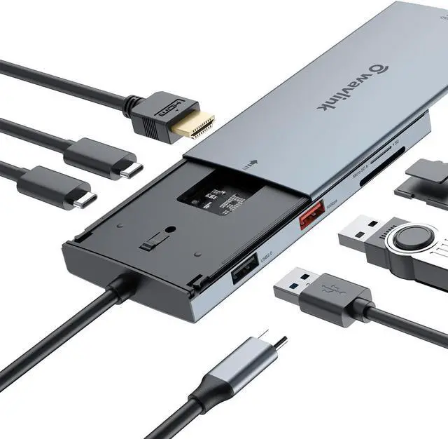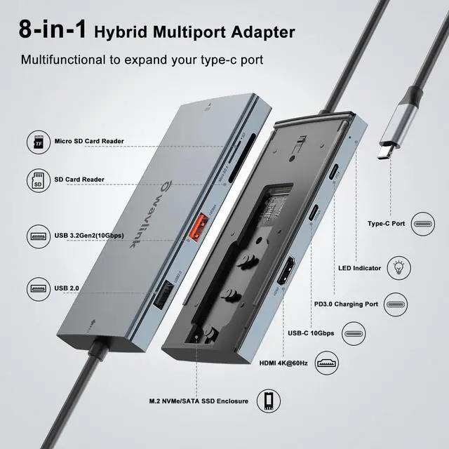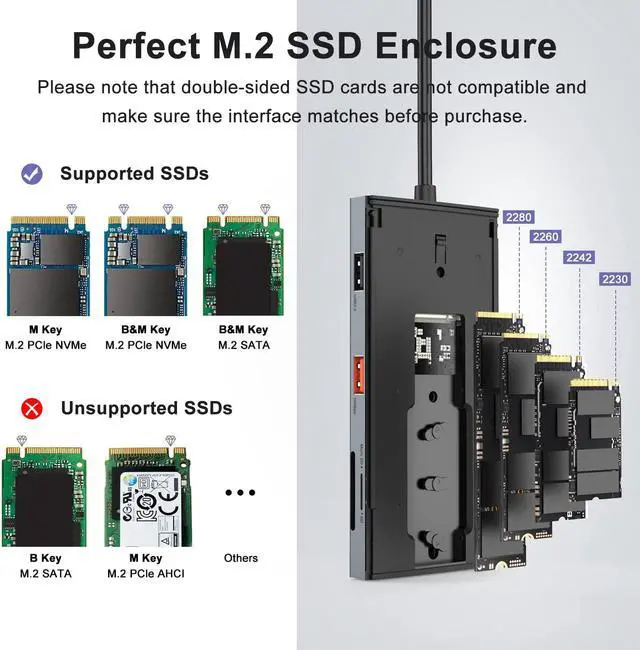 8-in-1 Hybrid Multiport Adapter: The multifunctional USB-C hub features built-in SSD storage, a PD charging port, a HDMI Port, 1x10Gbps USB-C Port, 1x10Gbps USB-A Port, 1xUSB2.0 and SD/Micro SD card slot. Plug and play for your USB C laptops, tablets, mobile phones and other devices to easily enlarge memory space or transfer files. Supports M.2 PCIe NVMe SSD and M.2 SATA (B&M Key).