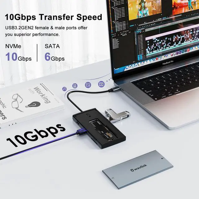 Transfer Files In Seconds: Built-in M.2 SSD enclosure supports 10Gbps M.2 NVMe SSD and 6Gbps M.2 SATA. Includes two USB3.2 gen2 data ports support up to 10Gbps, perfect for transferring large files in seconds. Another USB-A 2.0 helps extend your keyboard, mouse or connect usb flash driver. SD/Micro SD card slots support simultaneous reading at a speed up to 104 MB/s.