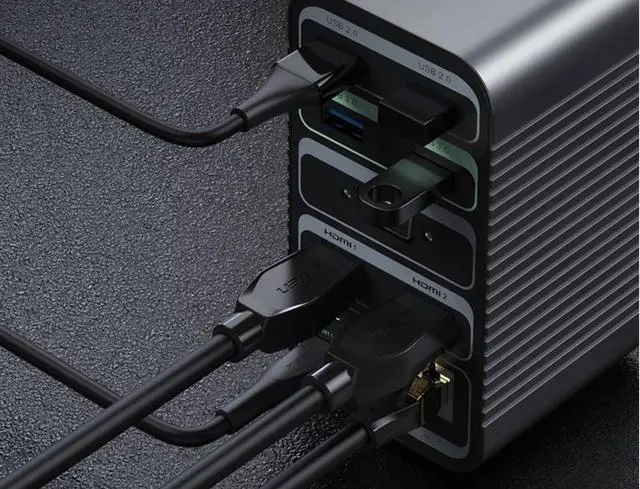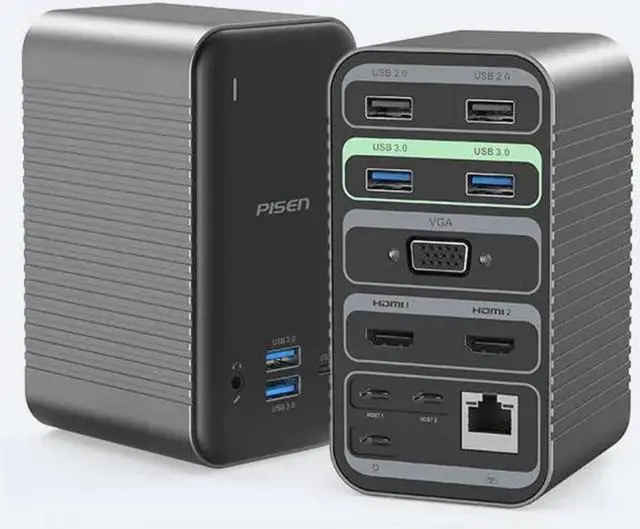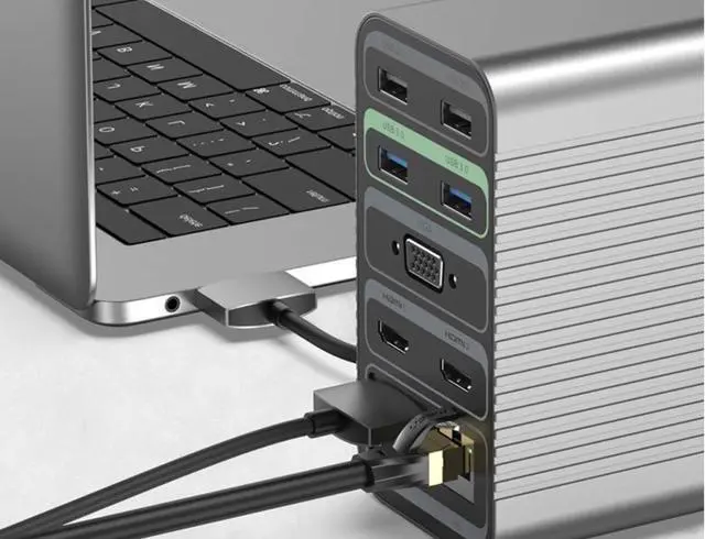 >>>14 Ports Massive Mac Docking Station: Features with 2 x 4K@30Hz|60Hz HDMI ports, 4 x USB 3.0 5Gbps, 1 x USB-C 5Gbps, USB C PD 3.0, 2 x USB 2.0 for keyboard and mouse, 3.5mm Audio/Mic, and RJ45 Gigabit Ethernet. Plug and play, no driver needed, help you create a complete triple display workstation.