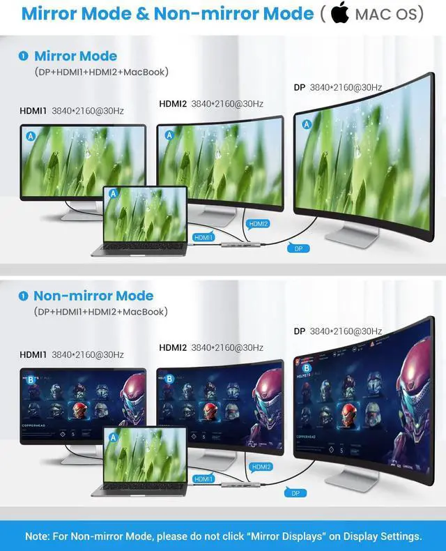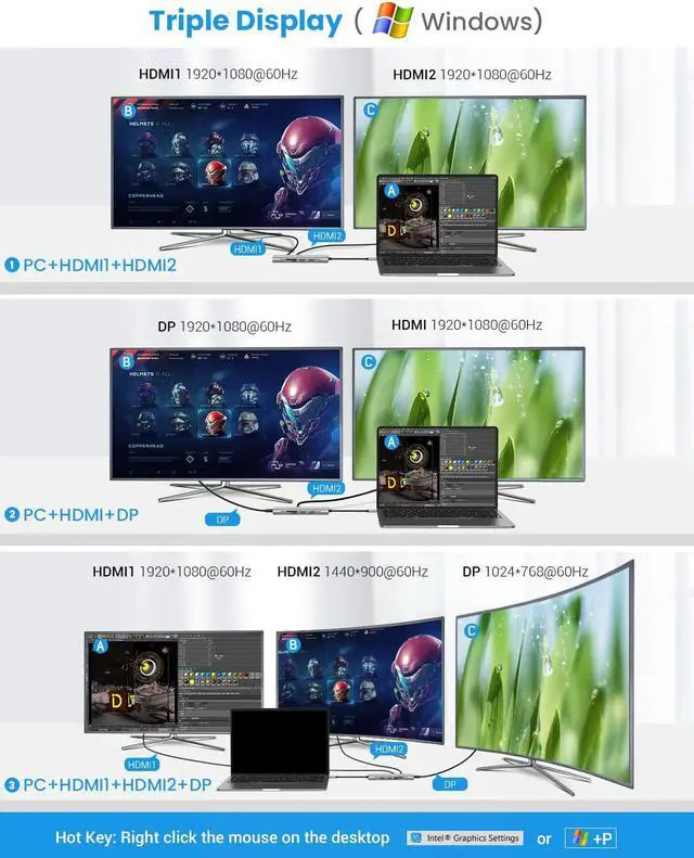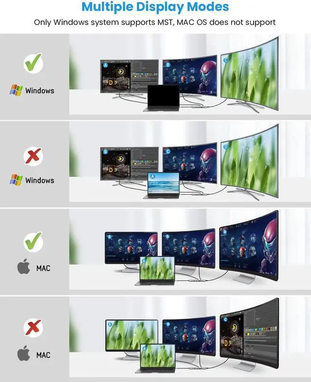 Crystal 4K Video Output Docking Station?3 Monitors: With the helps of QIYO MacBook?docking station, you are able to connect your external 3 monitors simultaneously. With maximum resolution up to 3840*2160@30Hz. Please note that when your Windows laptop expands to external 3 displays, your laptop screen will be blank. For more display settings and resolutions, please refer to the product description.