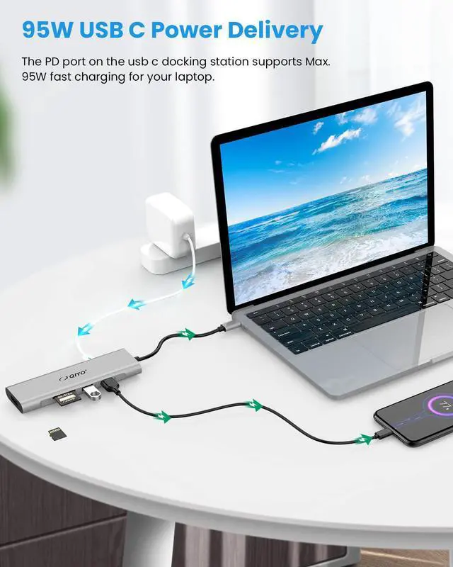 95W Fast Charging For Your Laptop: With the USB-C PD port on QIYO docking station, you can have maximum 95W power pass-through to charge your laptop when it is working. It is especially important to link the power cable of your laptop while it is connecting high-power consumption device such as a flash drive, hard drive, or printer, etc. Please note that this Power Delivery (PD) port has no data transfer function.