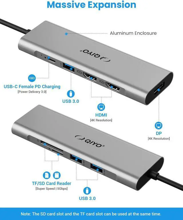 USB C Docking Station?Dual Monitor: QIYO 9 in 1 MacBook Pro?docking station has 2 built-in HDMI ports and 1 Display-port, plus regular USB 3.0 ports, PD charging port as well as SD/TF card slots. It is simply a plug-and-play USB C hub without?necessary to install any additional driver or software to make it functional.