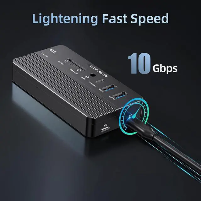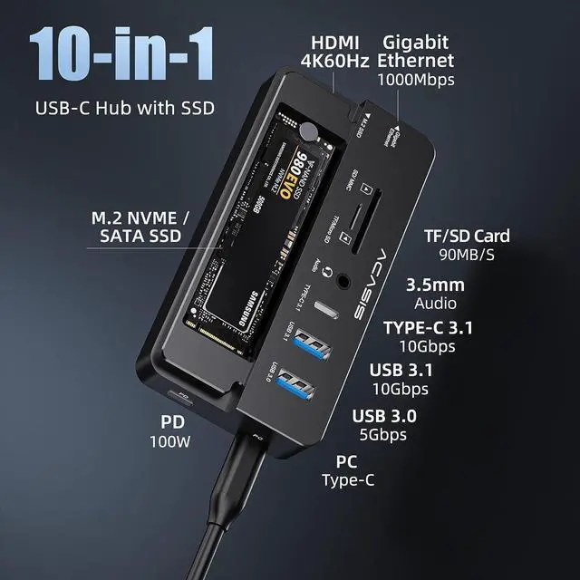 ACASIS 10-in-1 USB-C Hub with SSD enclosure: Easily extend your laptop from one type c/thunderbolt 3 port into 10 ports, you get 1*4K 60hz HDMI, 1*USB 3.1port, 1*USB 3.0 port1 USB C 3.1 Data Transfer port(Speed up to 10Gbps), 1 USB C Power Delivery Port(Up to 100W), 1 Gigabit Ethernet port(1000Mbps), SD/Micro SD card readers and 3.5mm Mic/audio.