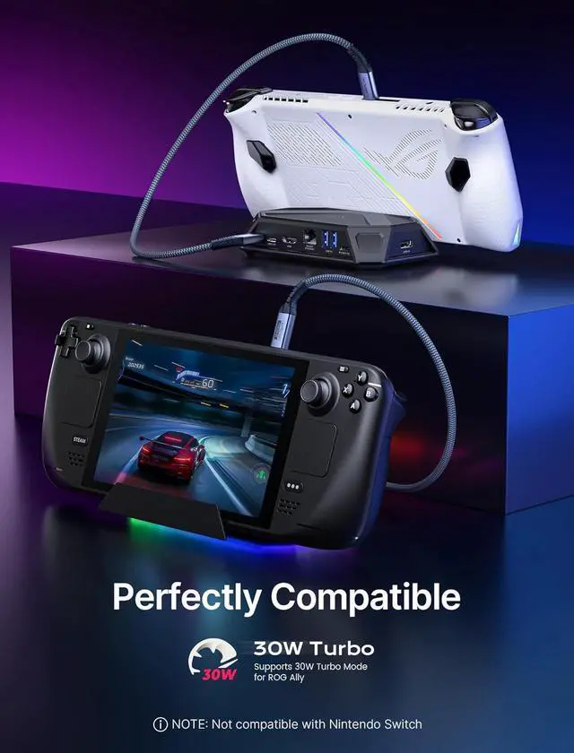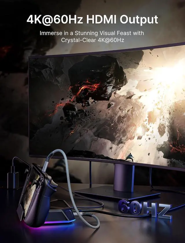 8-In-1 RGB Docking Station offers 2 USB-A 3.0 ports, 1 USB-C 3.0 port, and 1 USB-A 2.0 port to ensure you get fast data transfer at up to 5Gbps. With a USB-C PD 3.0 100W charging port, supports 100W max power input, which can quickly charge your tablets, laptops, and ROG Ally, Legion Go, Steam Deck (OLED) at full speed, providing a reliable power source for all your devices. NoteDue to different production lots, the appearance of the included USB-C cable may vary, but the function and quality are identical.