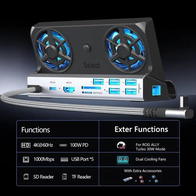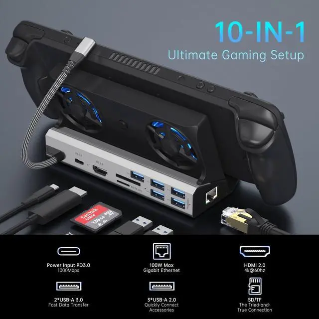 USB Type-C into 10 ports: 4K@60Hz, Gigabit Ethernet (1000Mbps), 2 USB 3.0 (5Gbps), 3 USB 2.0, USB Type C PD 3.0 (100W). SD/TF read slot, this handheld console dock combines hub, stand base, heat sink, it is a professional handheld gaming dock station.