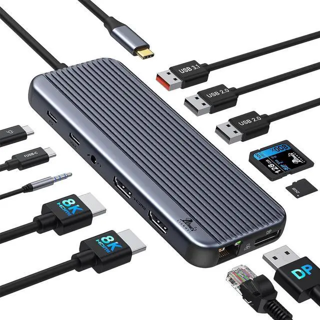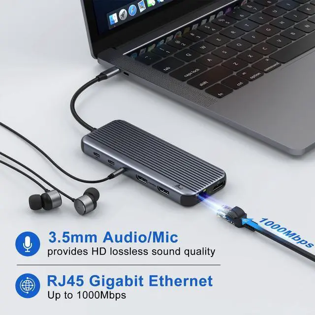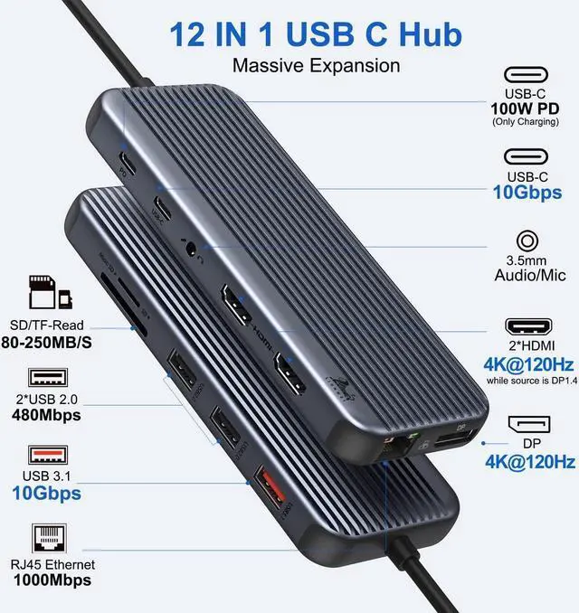 USB C Docking Station: LIONWEI dual monitor docking station contains 2 HDMI, DP, RJ45 Ethernet, 1 USB A 3.1 & 1 USB C 3.1 port, 2 USB 2.0, USB C Power Charging Port (max 100W), SD/Micro SD card readers and 3.5 mm Mic/audio. Just plug and play.