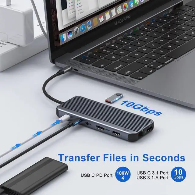 Fast Speed Data Transfer: This docking station comes with 10Gbps USB 3.1 (C & A port), SD/TF 4.0 slots with fast speed up to read: 80-250MB/S, write: 80-200MB/S. Also this dock support 10/100/1000 Mbps and Audio&Mic function.