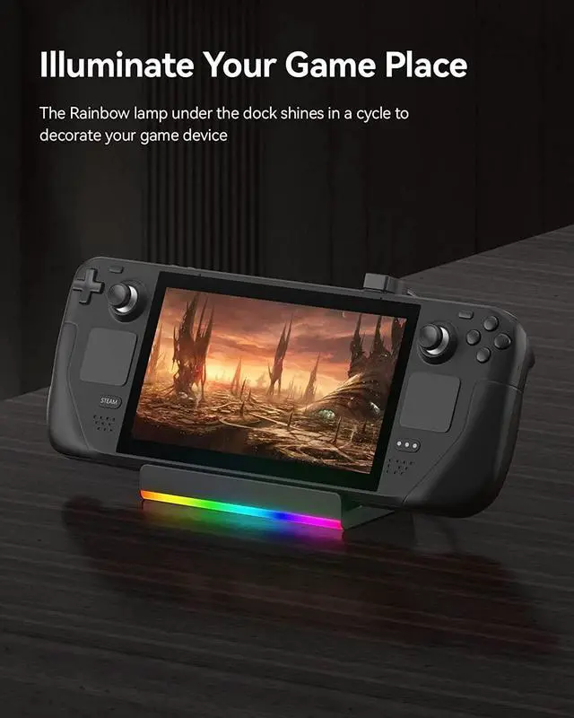 LED DecoratedThis steam deck dock is elaborately added with a colorful RGB light at the bottom. Colorful lights flash in a circular flow line to decorate your game room, immersing yourself in the game and advancing your experience.