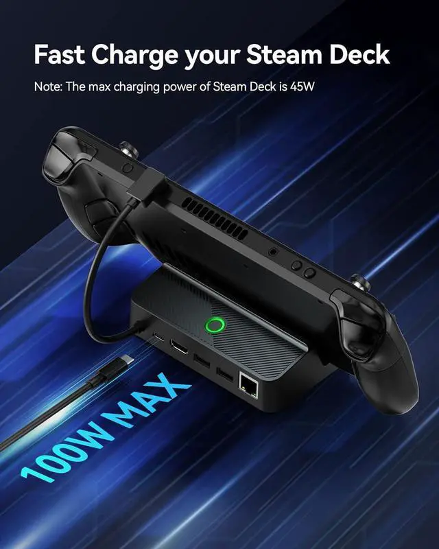 Full Charging SpeedThe docking station for Steam Deck supports 100W Max power input, which is sufficient to charge your Steam Deck at full speed when connect with the original Steam Deck charger.
