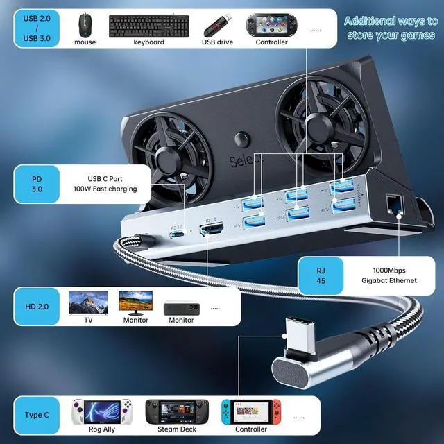 Product upgradeThe whole body of this steam deck dock is made of aluminum alloy shell, which is not only durable, but also has good heat dissipation, Additional upgrades include dual fans to help dissipate heat from your gaming devices more effectively. ensuring that your docking station for steam deck will be used for a longer time.