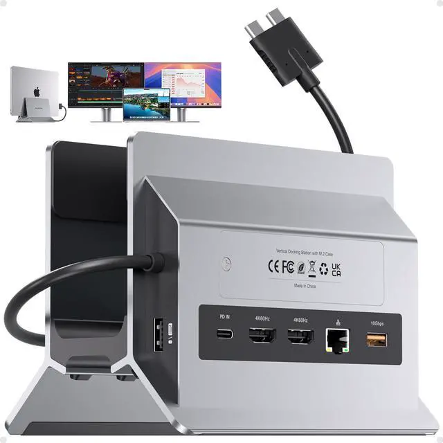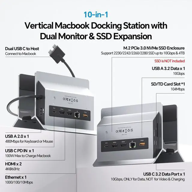 MacBook Pro Docking Station Supports 4TB M.2 SSD Expansion - The vertical MacBook docking station 2 monitors supports M.2 SSD expansion up to 4TB and transfer speed up to 10Gbps. Compatible with PCIe NVMe M.2 SSD in sizes of 2230/ 2242/ 2260/ 2280. Easy to expand the external hard drive to meet the insufficient storage needs of your Macbook. NOTE: 1). SSD is NOT included; 2). NOT support SATA SSDs and SSDs with heat sinks; 3) If your SSD are new, please format your new SSD into "exFat" or "apfs" format