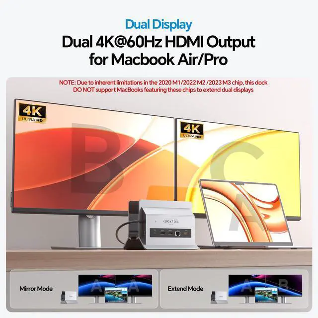 COMPATIBILITY - The MacBook docking station can ONLY extend dual monitors for Macbook Air 2018/2019/2020, Macbook Pro 14 inch 2021/2023/2024 M1 Pro/M1 Max, M2 Pro/M2 Max, M3 Pro/M3 Max, M4, M4 Pro or M4 Max chip, MacBook Pro 16inch 2019/2021 M1 Pro&M1 Max, 2023 Apple M2 Pro/M2 Max, 2023 M3 Pro/M3 Max, 2024 M4, M4 Pro or M4 Max chip, MacBook Pro, MacBook Pro 13 inch. NOTE: 1) Due to inherent limitations in the 2020 M1/2022 M2 /2023 M3 chip, MacBooks featuring these chips NOT support dual displays, ONLY can extend 1 monitor; 2) This dock ONLY for MacBook, NOT for windows or other laptops
