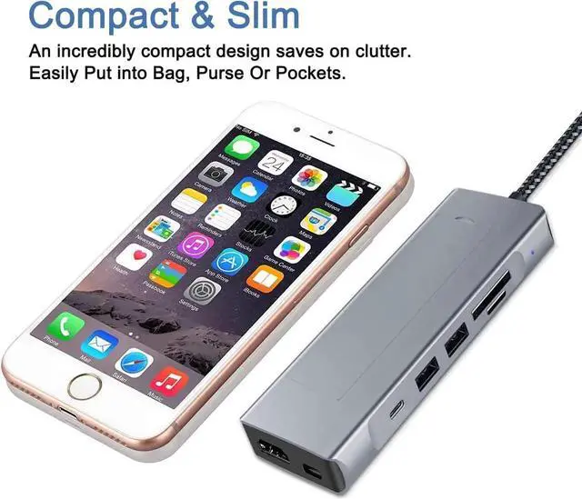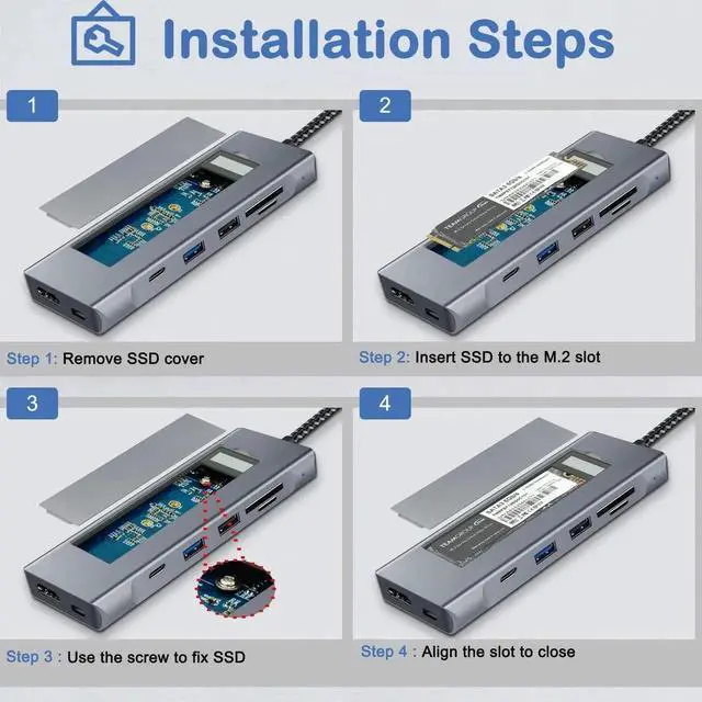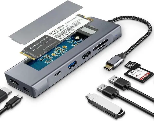 8-in-1 Multi port Adapter: The multifunctional USB C hub features built-in M.2 SATA SSD or M.2 PCI-e NVMe SSD to expand storage, a USB C PD charging port, a 4K HDMI Port, 1*10GMbps USB C 3.1, 1*USB3.0, 1*USB2.0 and SD/Micro SD card slot.