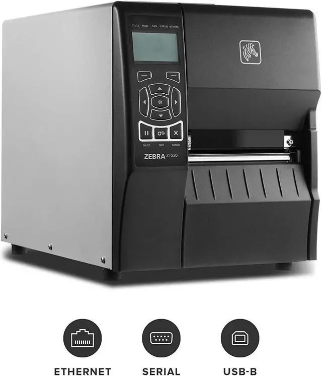 Industrial Label Printer, Zebra ZT230, Direct thermal, 203 dpi, 6 ips, Serial/USB/Ethernet, 4-inch Print width, US Power cord, Cables Sold Separately.