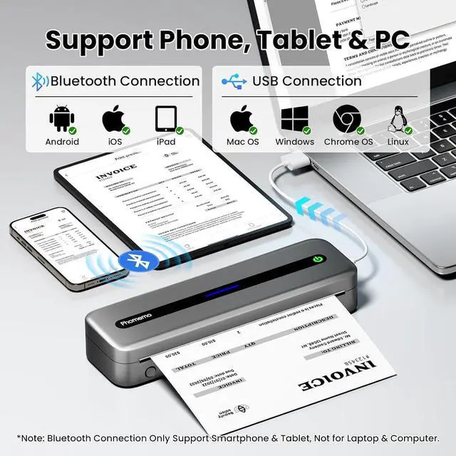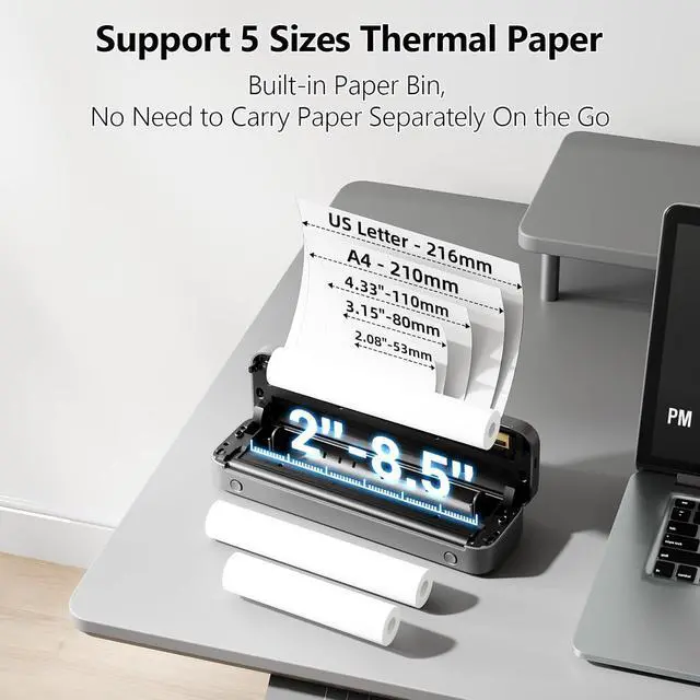 Support 5 Printing Sizes & 3 Types Thermal Paper: M832 portable thermal printer support print 8.5" X 11" US Letter, A4, 2.08''(53mm), 3.15''(80mm), 4.33''(110mm) thermal paper. The wireless no ink printer support thermal roll paper, fold and ordinary therma