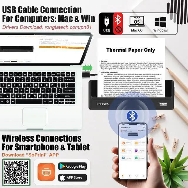Smooth Bluetooth and USB Connection PN81 wirelessly pairs with Android/iOS devices via Bluetooth and connects to laptops or desktop computers via USB, for simple setup and compatibility between devices. Download the app "SoPrint" for fast and reliable printing on mobile devices.