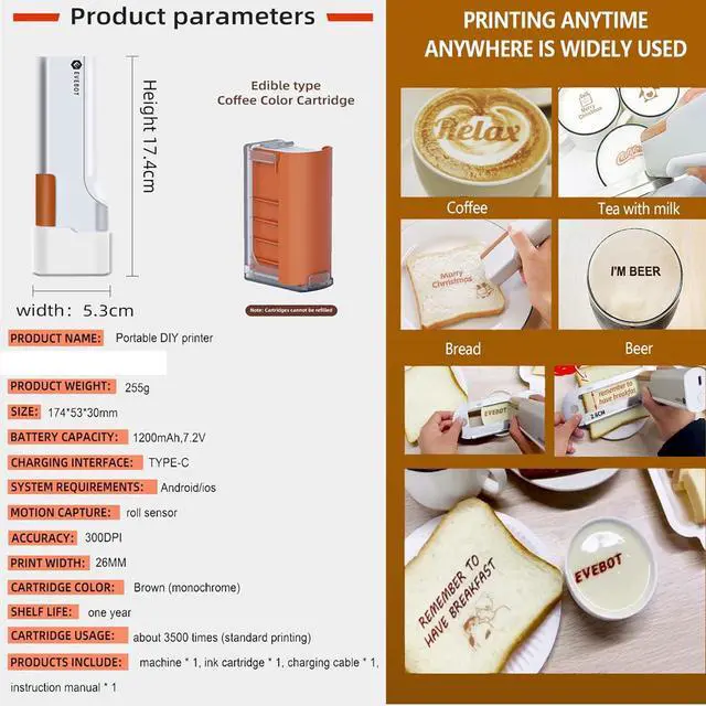 PrintPen Coffee Print Portable Inkjet Printer Handheld Edible Food Printer in Bread Cake MachineDescriptionPower: 1200mAh, 7.2V