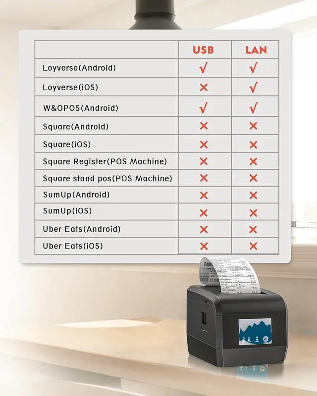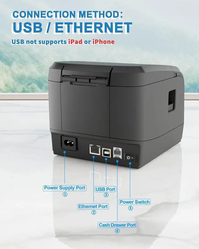 Compatibility: ZY908 thermal printer supports USB and LAN connectiondoes not compatible with Square, Shopify, Izettle, Grubhub, QuickBooksnot support Bluetooth and WiFi connection. Compatible with Windows, Mac, Android, Linux, ChromeOS, Cash Drawer.But note that USB cannot be used to connect to iPads and iPhones