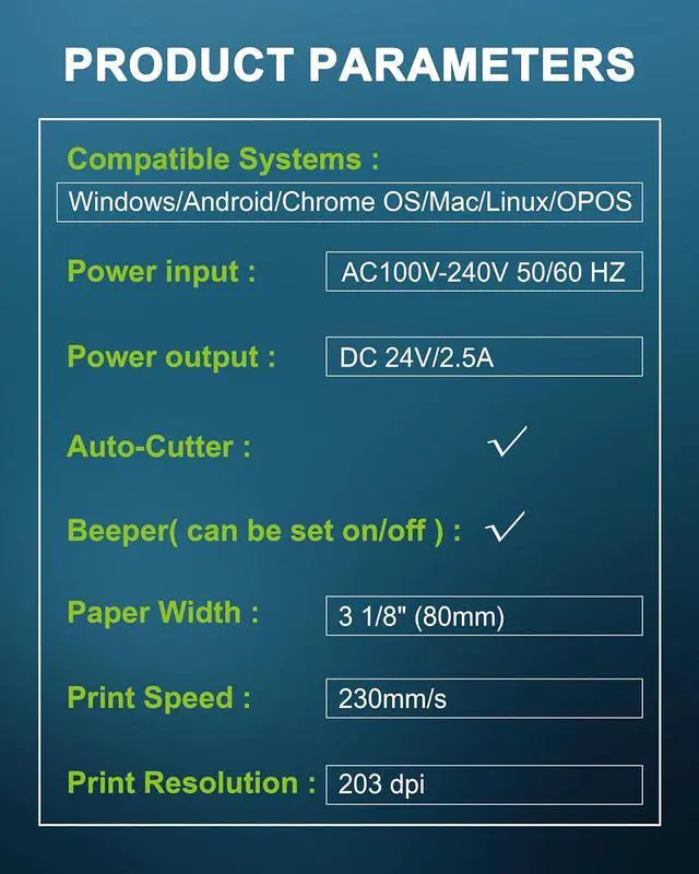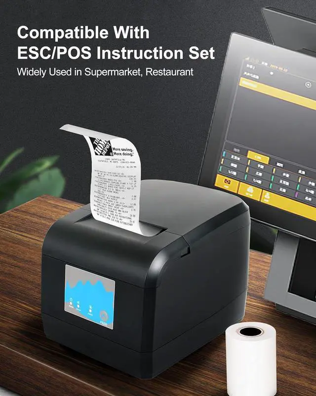 Printing performance: The ZY908 POS thermal receipt printer uses thermal printing technology, eliminating the need for ribbons and ink. The receipt printer has an automatic cutter and prints at a speed of 230mm per second with a maximum receipt width of 80mm
