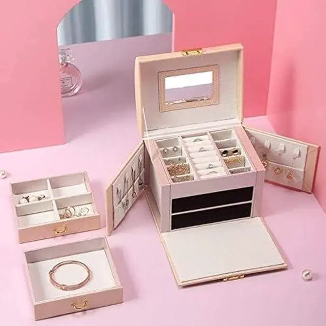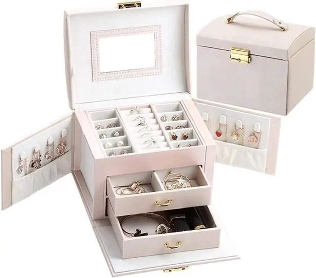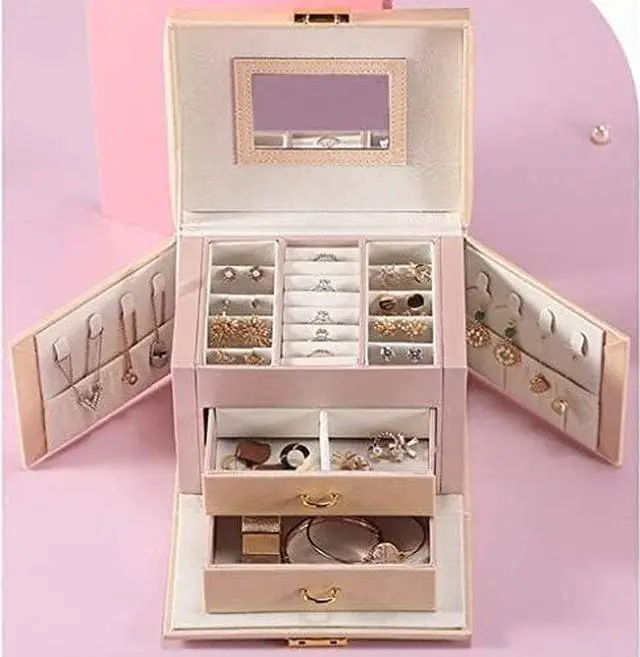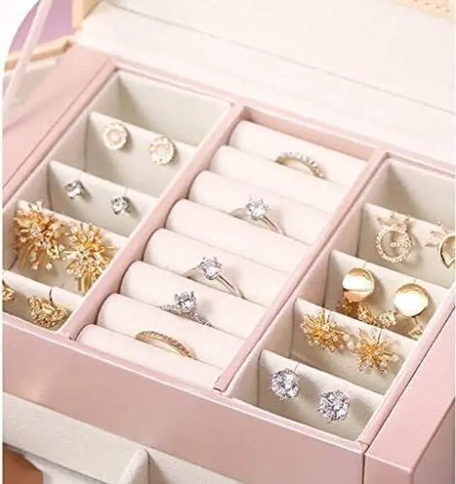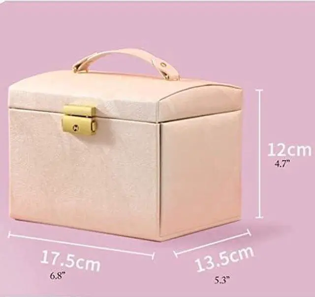 PU Leather Jewelry Box with Lock, Portable 2-Drawer Organizer for Rings, Necklaces, Earrings Pink, Large Capacity (Pink 17.5 * 13.5 * 12cm)