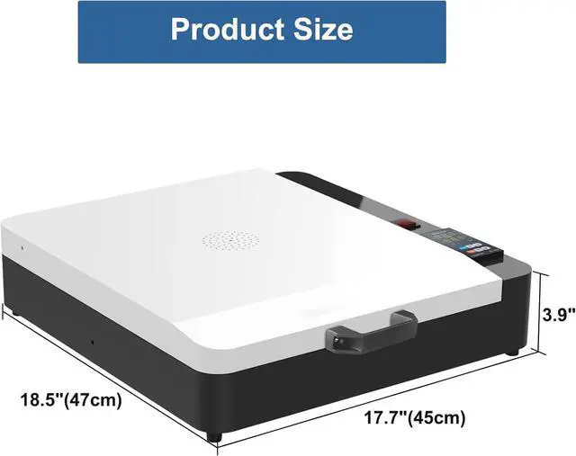 This latest generation DTF oven features large curing size 11.8x15.7inc, perfect for curing films up to A3/A4/A5 and more. Built-in powerful aluminum heating plate, making the heating faster and more evenly. The compact design, scientific structure and accurate temperature control guarantee consistent and high-quality results, make it a must have for any DTF printing operation. Features: