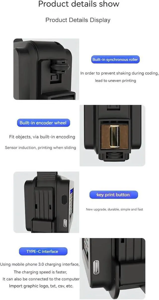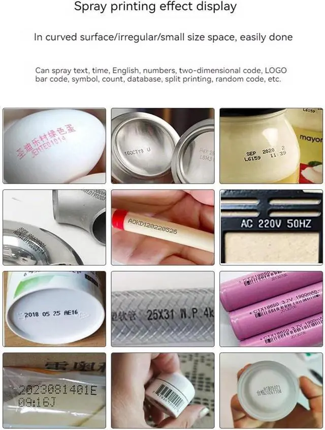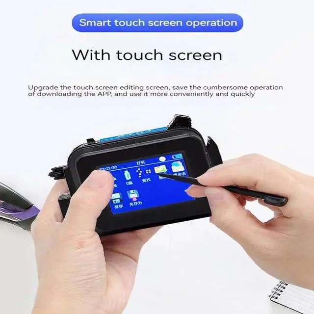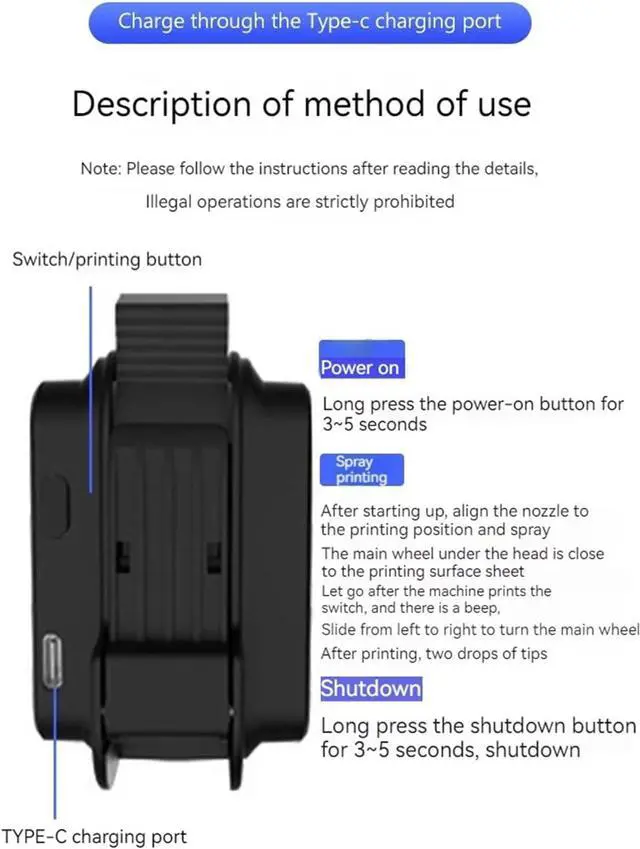 Instructions for usePower onPress and hold the power button for 3-5 secondsPrintingAfter turning on the machine, align the nozzle at the printing position. The main wheel under the nozzle is close to the printing surface. Click the printing switch and let go. There will be a beep sound and slide from left to right to rotate the main wheel for printing. After printing, there will be two beep sounds.Shut downPress and hold the power off button for 3-5 seconds, the light will turn off after power off.Product name: Mini inkjet printerInk cartridge: A black, B red, C yellow, D blue, E greenPrinting height: 12.7mmEquipment size: 73*110*40mm (bare metal 180g) parameters: 7.4V 1500mAhPrinting material: paper, glass, metal, plastic, etc.Print content: Chinese and English, numbers, pictures, production date, barcode, logo, etc.Printing length: 100cmDPI:800DpiEquipment material: ABSCharging interface: type-c interfaceOperation mode: touch screen operationMoving speed: no higher than 10cm/secondPackage:Host*1Ink cartridge*1Instruction manual*1Packing box*Notice:1: Due to manual measurement, please allow 2-3cm deviation. Thank you for your understanding.2: Due to the calibration of your monitor, the item color shown in the photo may be slightly different from the actual item.