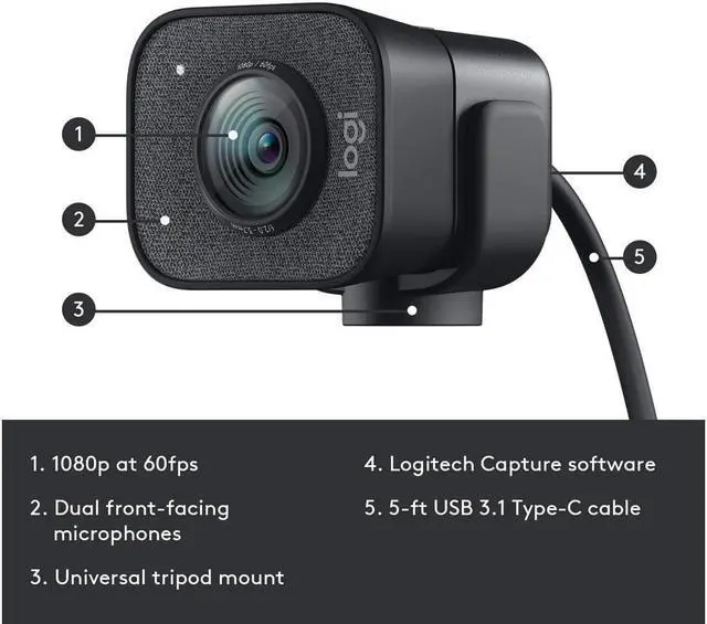 System Requirements Windows 10 or above | macOS 10.14 or above | 7th Gen Intel Core i5 or later | USB 3.1 Gen 1 Type-C direct connection Recommended for 1080p 60 fps Take your content to the next level and share your passion with Logitech StreamCam. Featuring pristine image quality, dual front-facing microphones, versatile mounting options, and USB-C connectivity, it’s the perfect camera for broadcasting to your favorite streaming platforms—all you need to do is be yourself! A Powerful Combination Logitech StreamCam is even more powerful when used with Logitech Capture. Capture unlocks features on StreamCam that automate exposure, framing, stabilization and more, so you can focus on making your best content.