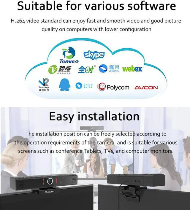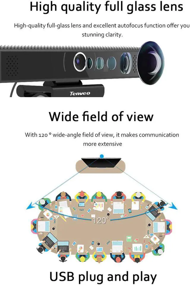 VA1000 is a Conference Cam designed for Huddle rooms and small conference rooms. With a 1/2.7 CMOS sensor (Sony IMX307 ), 2.5mm lens, 120 °ultra-wide field of view, VA1000 makes everyone in the conference room clearly visible. 1080P/30FPS UHD optical lens bring extraordinary video quality to enhance face-to-face collaboration. Integrated audio is optimized for small spaces, and delivers an exceptional sound experience. Two Omni directional microphones and two high-fidelity speakers h ensure the sound as great as they look. With a compact all-in-one design, USB plug and play and simply works with any video conferencing software application and cloud services.