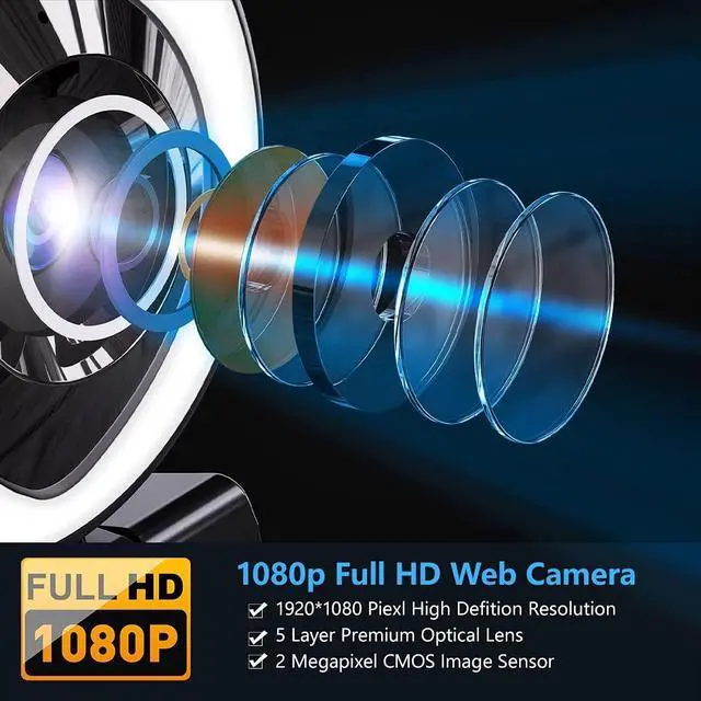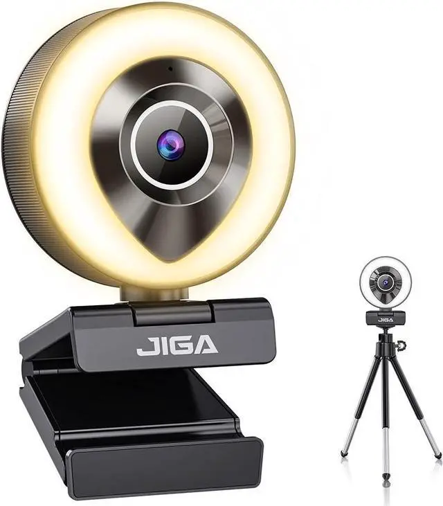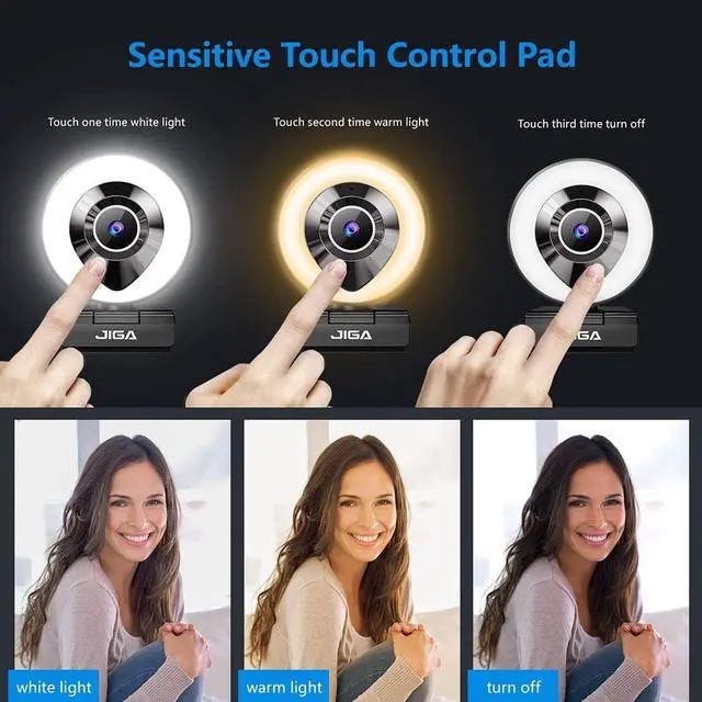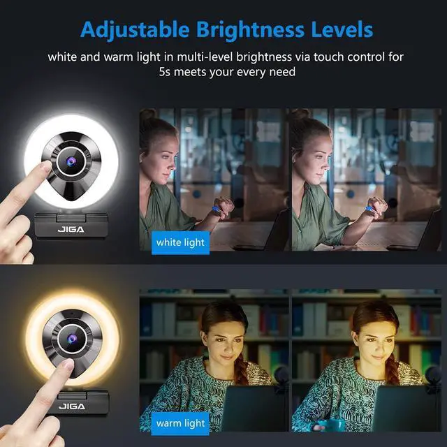 2 Light Modes & Adjustable Brightness The lighting webcam feature 2 lighting modes and adjustable brightness. Low to high brightness can be adjusted by long press, white or warm light can change by click. Consists of 24 light beads, the web cam provides a more even and complete ring of light and glow further away while protecting your eyes from glare.