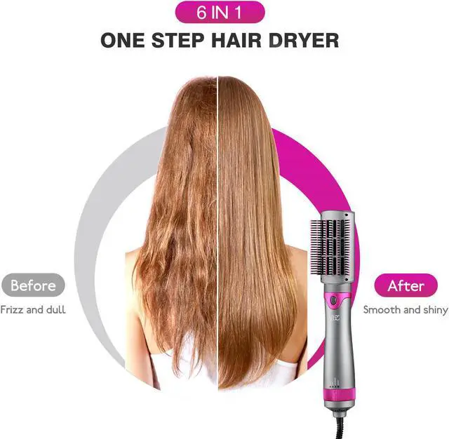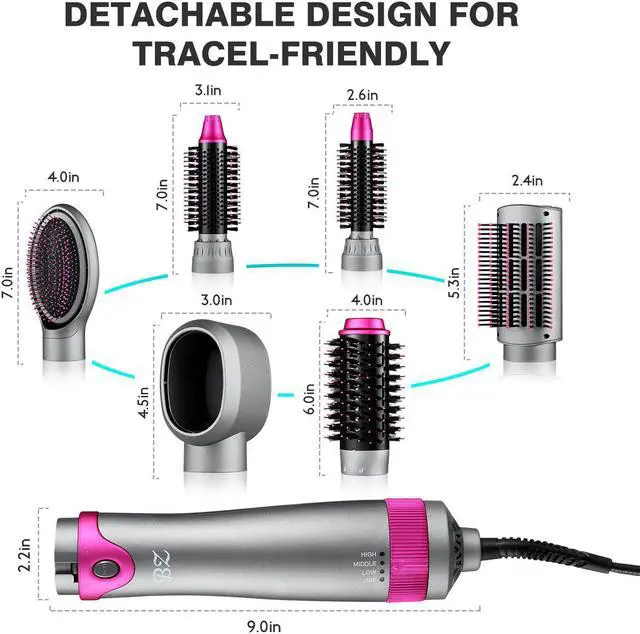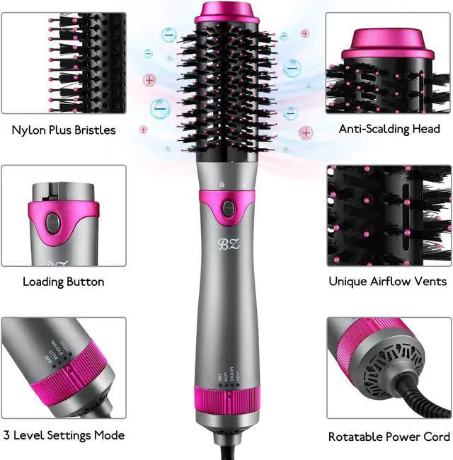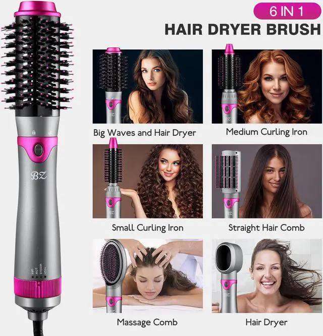 BZ Hot air brush dryer with interchangeable brush heads. six brush heads to meet different styling needs Perfect combination of hot air brush, scalp massager and hair styler, this hair dryer hot air brush enables you to dry, straighten, curl, add volume and massage scalp at the same time. Suitable for various hair types, such as long, thick, damaged or colored hair Enjoy a salon experience in the shortest time: If you have a hot air brush, you do not need to get up early to wash, blow dry, and curl your hair. This magical device can dry, curl and straighten, and is ideal for increasing the softness of curls. Maximum protection of your precious hair: Advanced ion technology brings excellent smooth perforation effect, and the titanium barrel is also coated with ceramic coating to make the heat distribution more even. It can highlight the multi-layer style very well, but please note that it works best when used on damp rather than soaked hair. 3 Temperature and 2