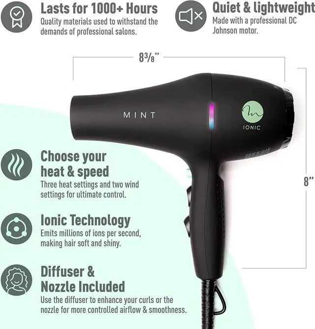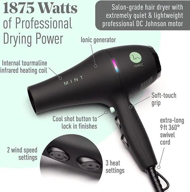 DRY YOUR HAIR IN HALF THE TIME This hair dryer is equipped with a professional DC Johnson motor, specially engineered to provide strong air speed and 1875 watts of professional drying power.