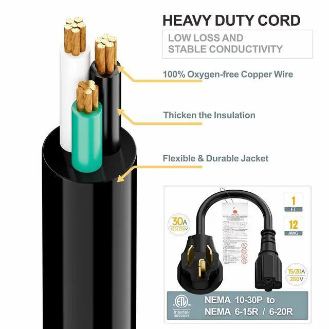 1FT Nema 10-30P 30Amp Dryer Plug Male to 6-20R T-Blade Female Adapter,30A 125/250V Dryer 3-Prong Plug to 20A 250V 6-20/15R Adapter 12-AWG