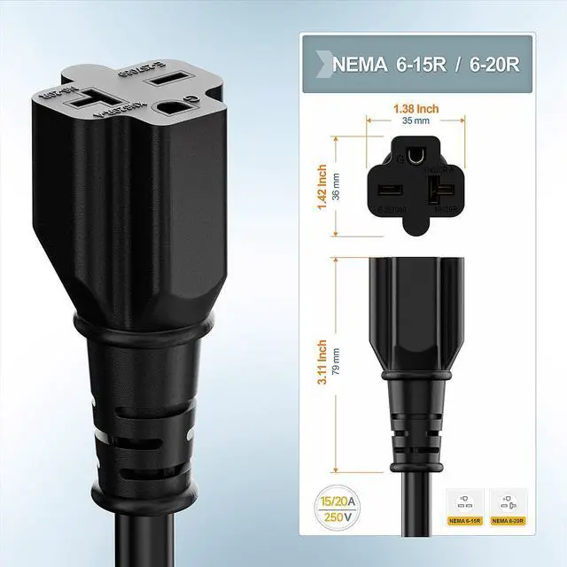 • Nema 6-20R female rated 20A 250V, it works only in 250V situation, the 6-20R female is also compatible with Nema 6-15R (15-AMP 250V).