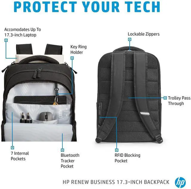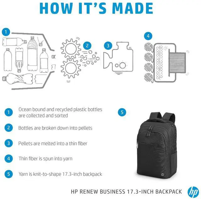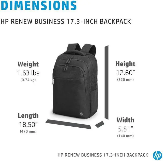 Now you can feel good about the backpack you use to protect your laptop. Designed to keep your laptop protected and accessories organized the Renew Business 17.3 -inch Laptop Backpack uses environmentally-responsible materials that are durable easy to clean and designed for comfort. Miscellaneous Application/Usage Notebook Accessories Compatibility HP - Elite Dragonfly G2 470 G8 Brand Compatibility HP General Information Product Type Carrying Case Manufacturer Part Number 3E2U5AA Manufacturer HP Inc. Product Name Renew Business 17.3 Laptop Backpack Product Line Renew Brand Name HP Physical Characteristics Material Plastic Weight (Approximate) 1.63 lb Height 18.5" Width 12.6" Depth 5.5" Product Information Carrying Options Handle Trolley Strap Shoulder Strap Style Backpack Maximum Screen Size Supported 17.3" Closure Type Zipper