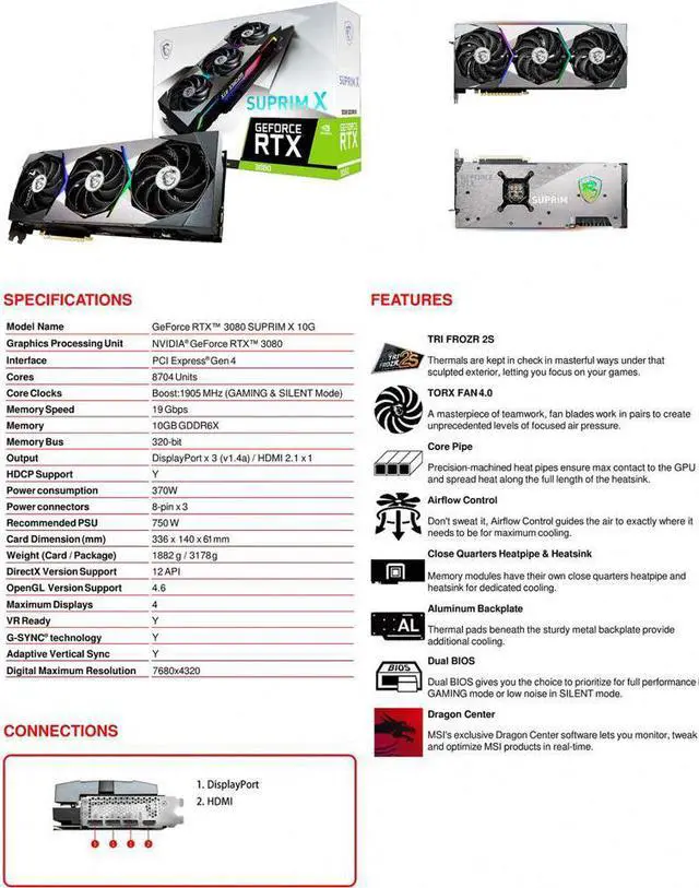 MSI Suprim GeForce RTX 3080 10GB GDDR6X Video Card RTX 3080 SUPRIM X 10G LHR
