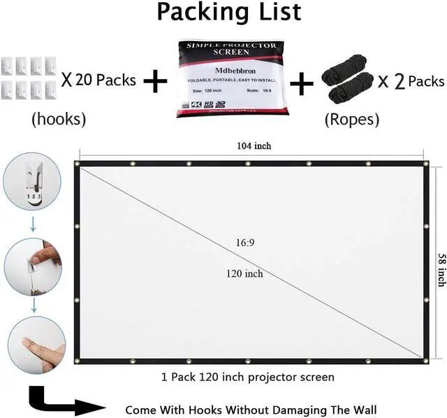 EASY TO SET UP The Projection Screen can be fastened easily with hooks, ropes, bracket, nails, double side tape on the wall/mount.