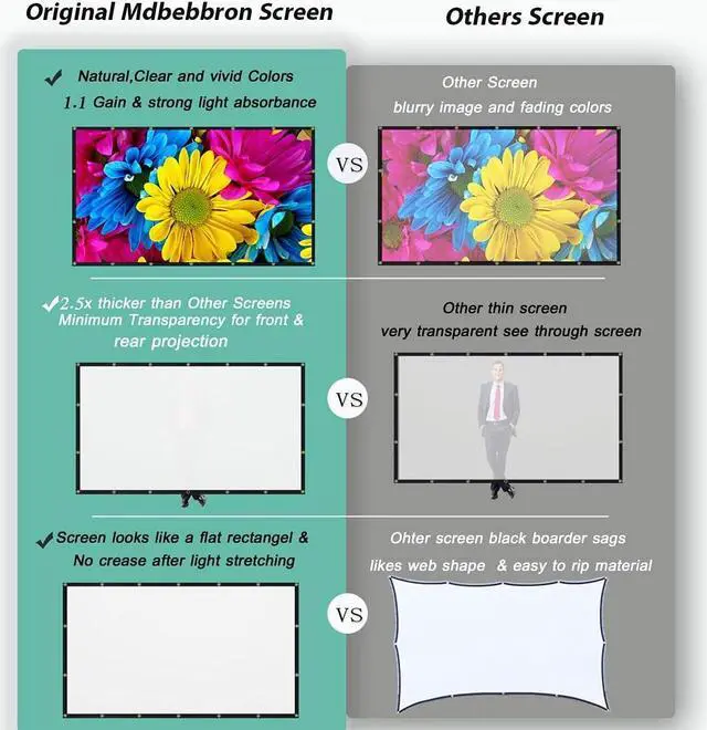 ANTI-CREASE AND HIGH ABSORBANCE MATERIAL - Made with natural Polyester fabric that The projection is sharper and brighter than most other projection screens, The Projection Screen are thicken and smooth, no wrinkle when folded / crushed.