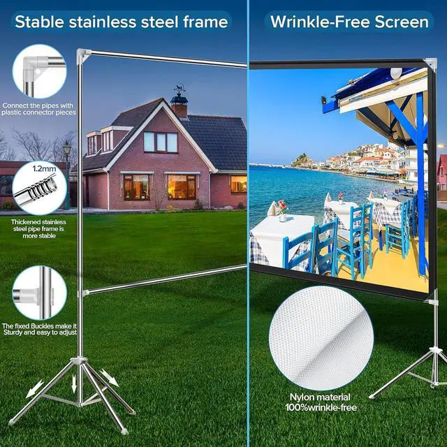 Set up in Just 8 Minutes: The frame and legs of Velcolt projector screen and stand lock in place without tools, and hand screws attach the legs to the frame. It comes with a carrying bag, ground nails, windproof ropes, joints and buckles, so you don't need another trip to the store and quickly get fun in watching movies.