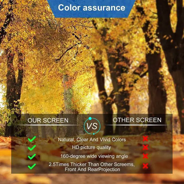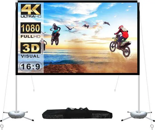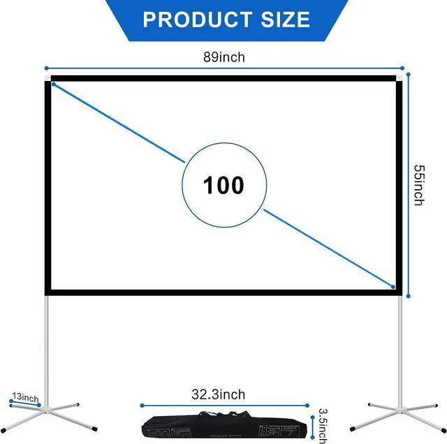 PROJECTOR SCREEN WITH STAND100 inch Portable projection screen, 16: 9 format, 160° Wide Viewing Angle. The projection screen has made of high-quality polyester & spandex material. That offers sharp and high-resolution images, even support Front & Rear projection.