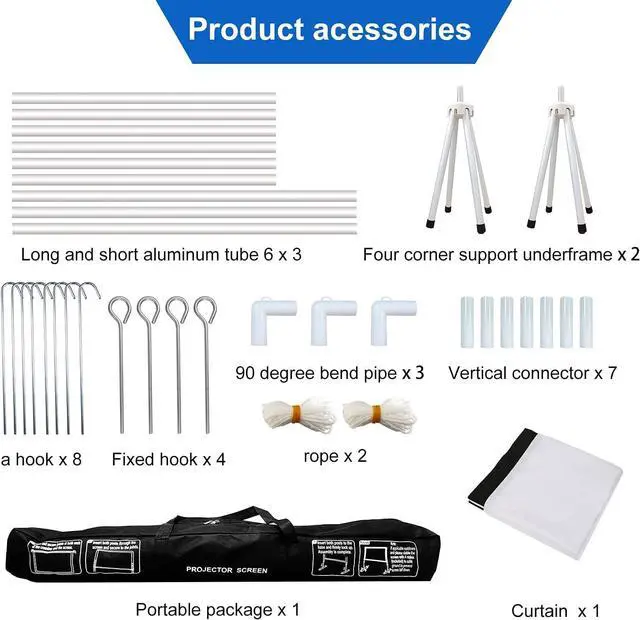 SETUP ONLY TAKES 5 MINSThe projection screen can be set in about 5 minutes without any complicated tools. No screws, no strings, only several kinds of accessory, enough to fastly and firmly set it up.