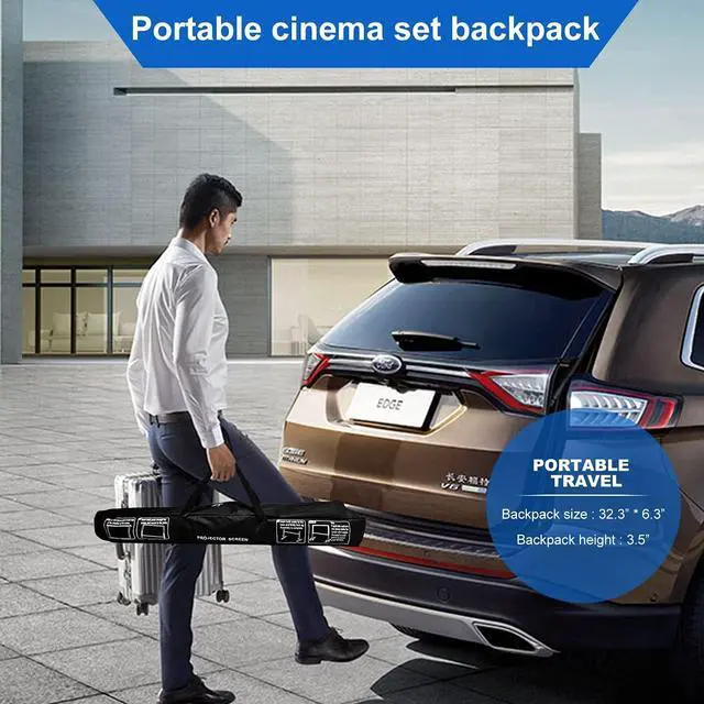 CONVENIENT TO CARRYRear projection screen with stand has weight of 6 lbs. You can hold it on one hand or put travel bags on your shoulders, easy to carry in anywhere you want and pack away. It easily stowed away in the CAR TRUNKS, Sedan included! That make it easy to travel along with for family trips, camping, or backyard movie night ect.