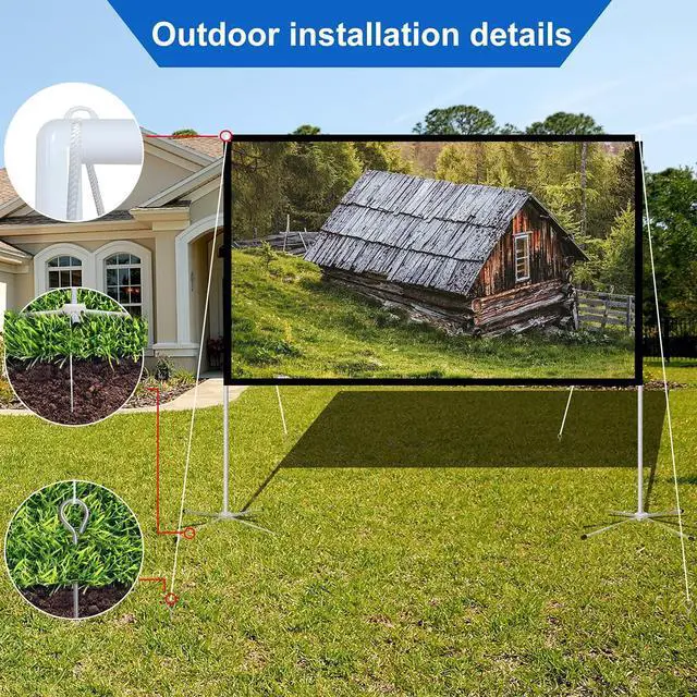 DURABLE STABKE FRAMEThe foldable outdoor projector screen with unique base of the stands keep stable. Deeper plastic joints can be perfectly insert into aluminum poles with a tight fit to avoid loose. In addition, it comes with 4 stainless steel stakes, and it can be inserted in the hole of the bases when in the lawn, which can improve the stability. Don't worry about windy weather.