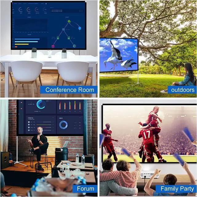 APPLICATION AREAS This projection screen can be used both indoors and outdoors. like camping, backyard movie, home theater, the large commercial activity center, performance entertainment center, even mini drive-in theater etc.