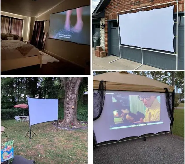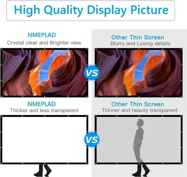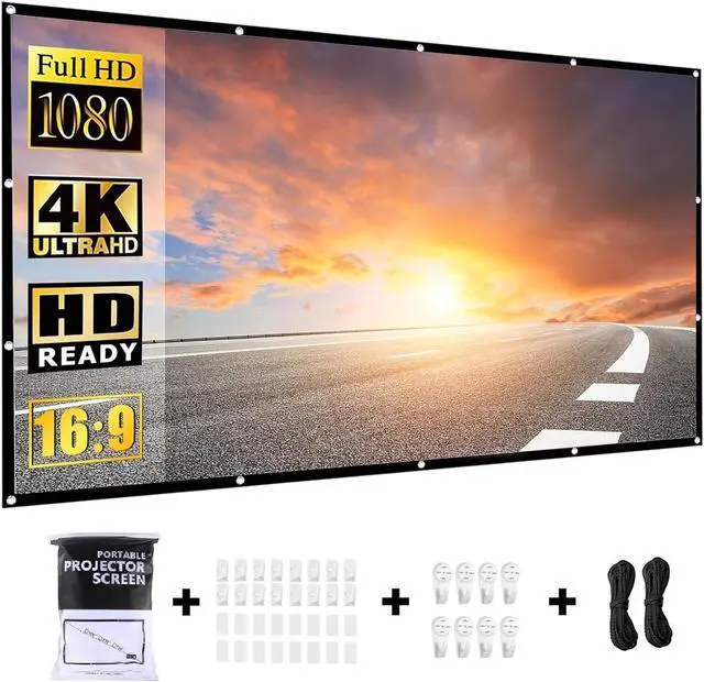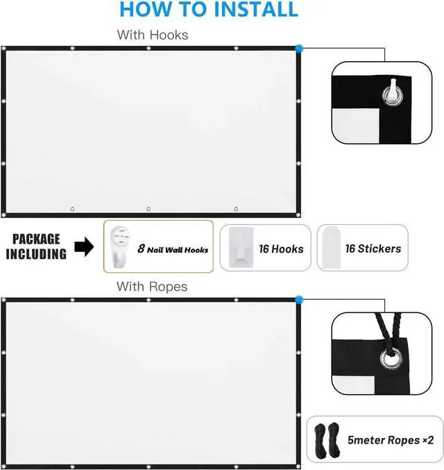 Easy to install and carryThis outdoor indoor projector screen is equipped with enough tools: 8 nail hooks, 16 sticky hooks, 16 stickers, 2 ropes (5M) to meet different needs, it only takes a few minutes to install. Folding projection screen makes it easy to carry.