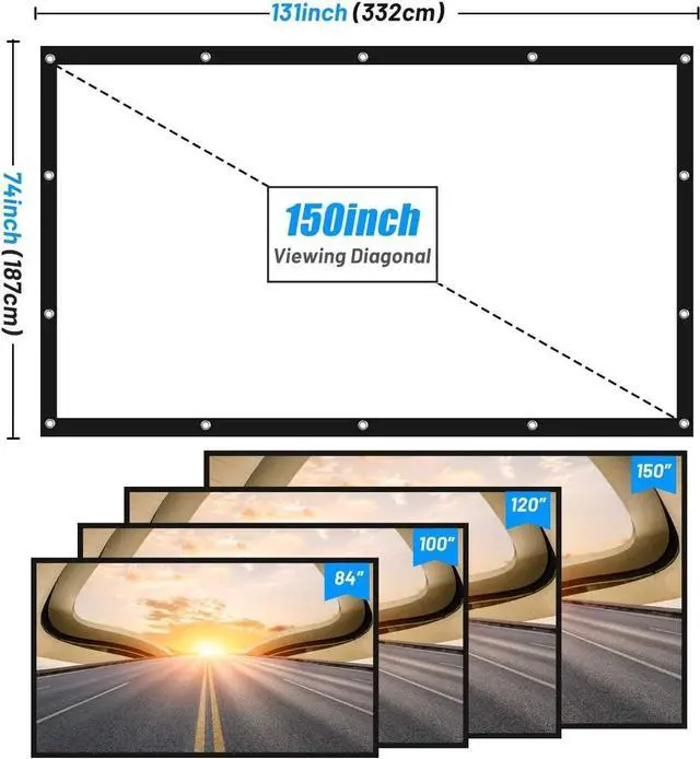Choose the right size 16:9 projection screen format is suitable for most movies and games, please choose the most suitable size you need: 60"-72"-84"-100"-120"-150"-200"- 250-300.
