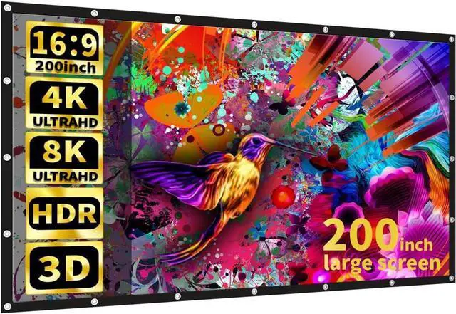 [Fold-able Projector Screen] The Projector Screen will not wrinkle when folded / flattened, which means you can fold the screen into a small size and then put it in backpack or suitcase or throw in the drawer until you need it again. Supports 3D, HD movies, high color reflection. 200 inches, 16:9