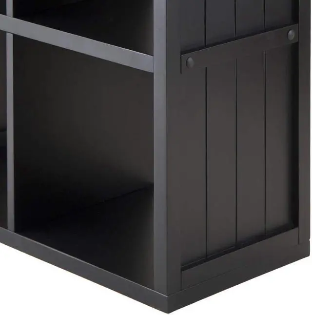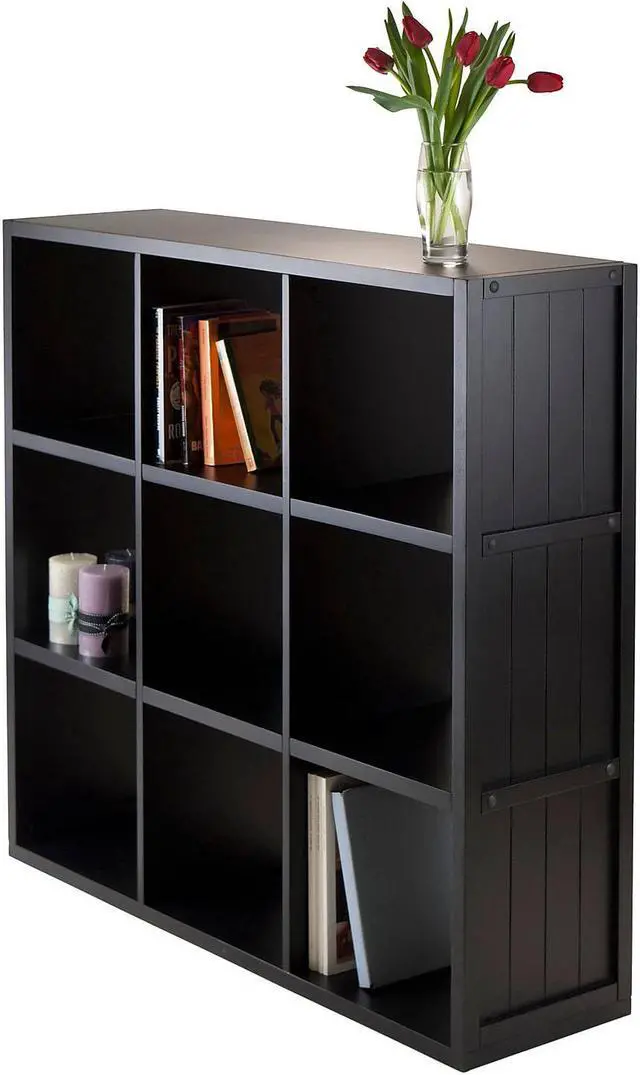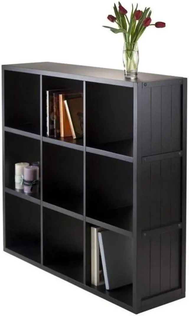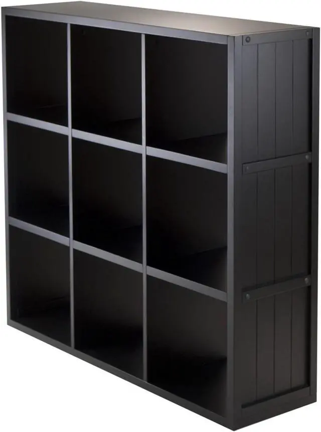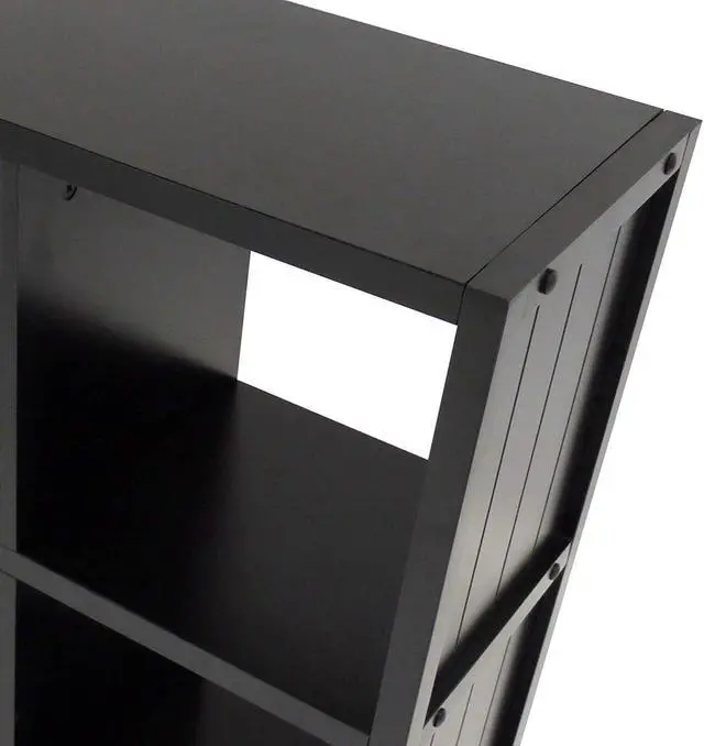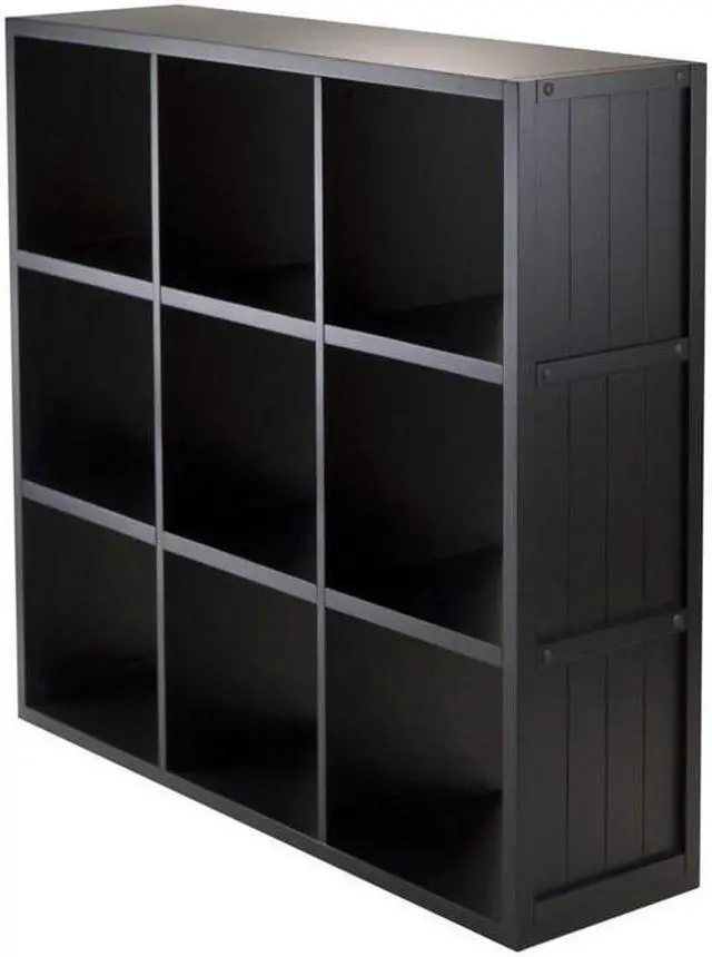 Includes tools and hardware. Three shelves. Nine cubes. Warranty: 60 days. Made from composite wood. Black finish. Assembly required. Cube: 12.05 in. W x 11.81 in. D x 11.54 in. H. Overall: 37.76 in. W x 11.81 in. D x 40.08 in. H (48 lbs.).