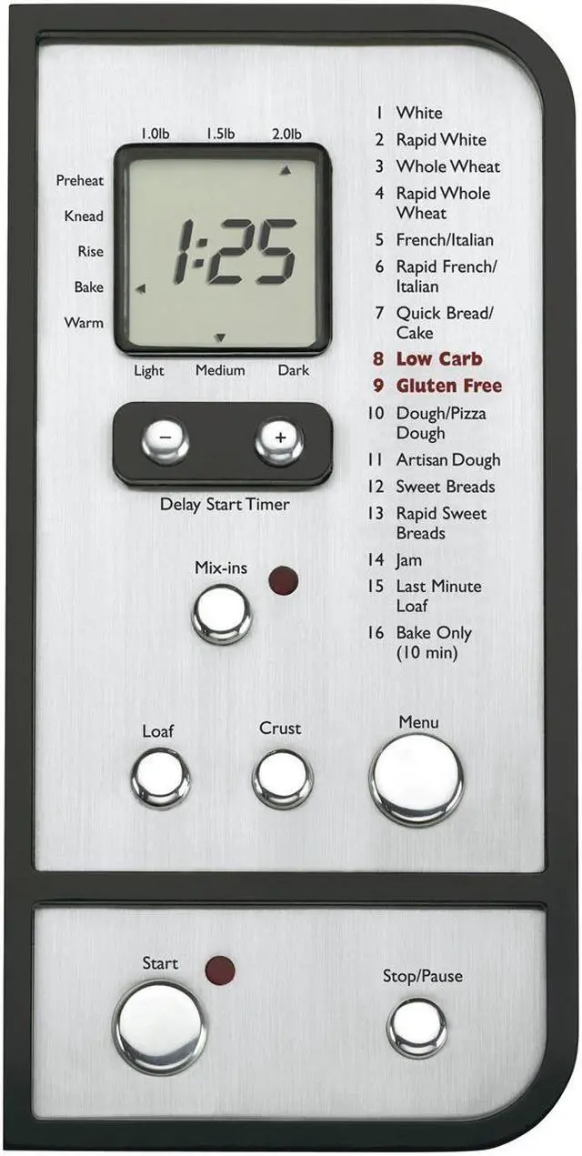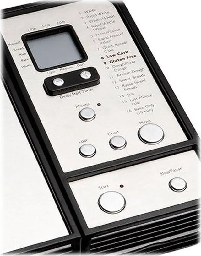 Wake up to the smell of freshly baked bread with this programmable bread machine. The 680-watt appliance automatically adjusts the speed and timing for foolproof results, while its convection fan circulates air during baking for superior crust color and texture. Exclusive Low Carb, Gluten-Free, and Artisan Dough settings are just 3 of 16 preset menu options available with the touch of a button. The Artisan Dough menu option takes basic bread dough through several long, slow, cool rises for chewier textures and rustic crusts. Along with the 16 preset menu options, the unit offers three crust colors and three loaf sizes, to give bread lovers a choice of over 100 bread, dough, sweet cake, and jam combinations. Its perfect-timing audible tone indicates when it's time to add fruit, nuts, or other mix-ins, and a second tone offers the option of removing the paddle before baking or removing unbaked dough to shape by hand. Other convenient features include a 15-minute pause, a bake-only option, a 12-hour delay-start timer, power-failure backup, and large stay-cool handles. With its classic lines, smooth brushed stainless steel, and embossed logo, this attractive bread machine looks great on the countertop for convenient, everyday use. The unit measures 18 by 12-1/5 by 14-7/8 inches and carries a three-year limited warranty.